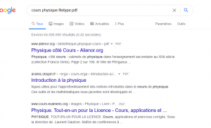 Le mot clef filetype: permet de limiter le résultat de la recherche au format de fichier spécifié. Exemple PDF, JPG, DOCX ….
