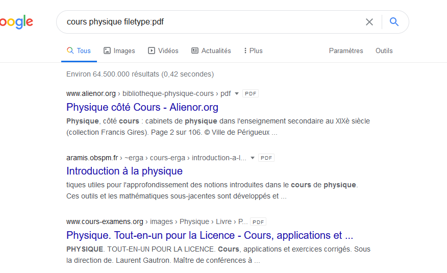 Le mot clef filetype: permet de limiter le résultat de la recherche au format de fichier spécifié. Exemple PDF, JPG, DOCX ….
